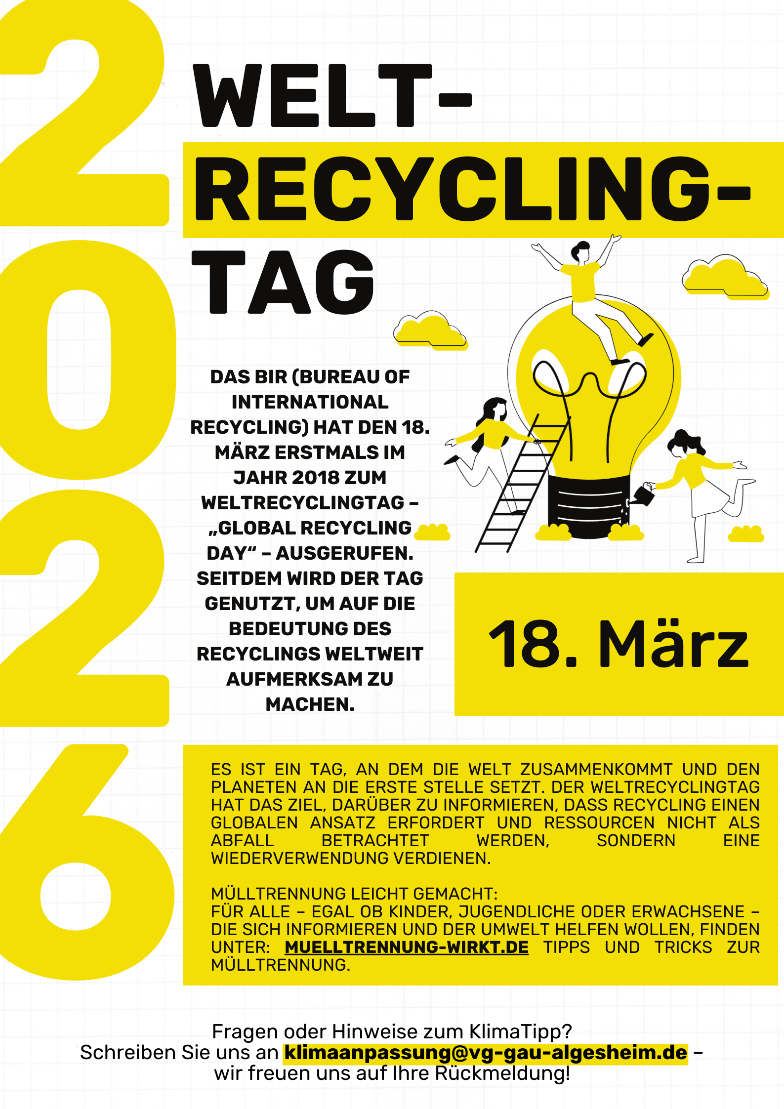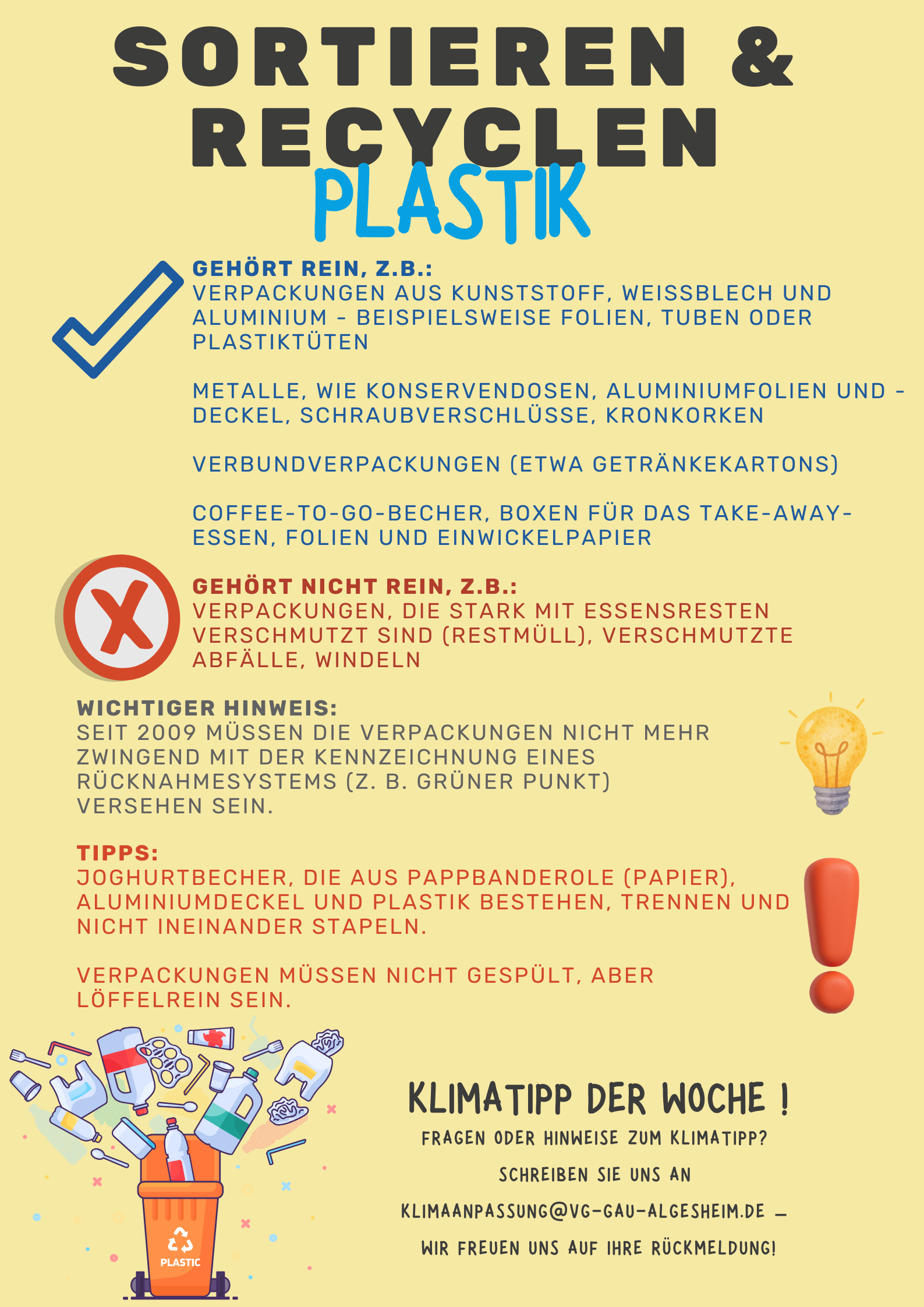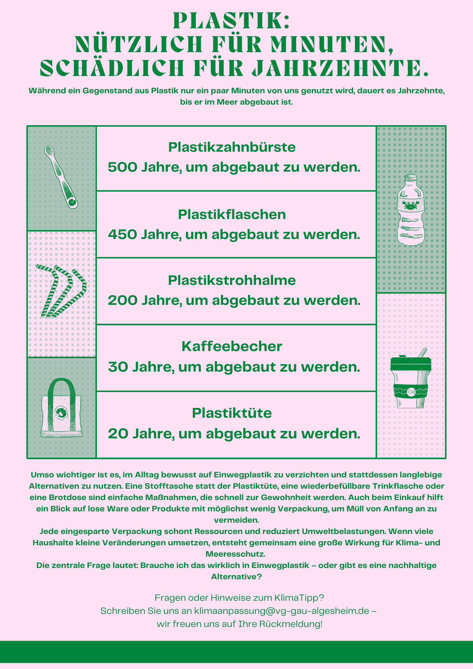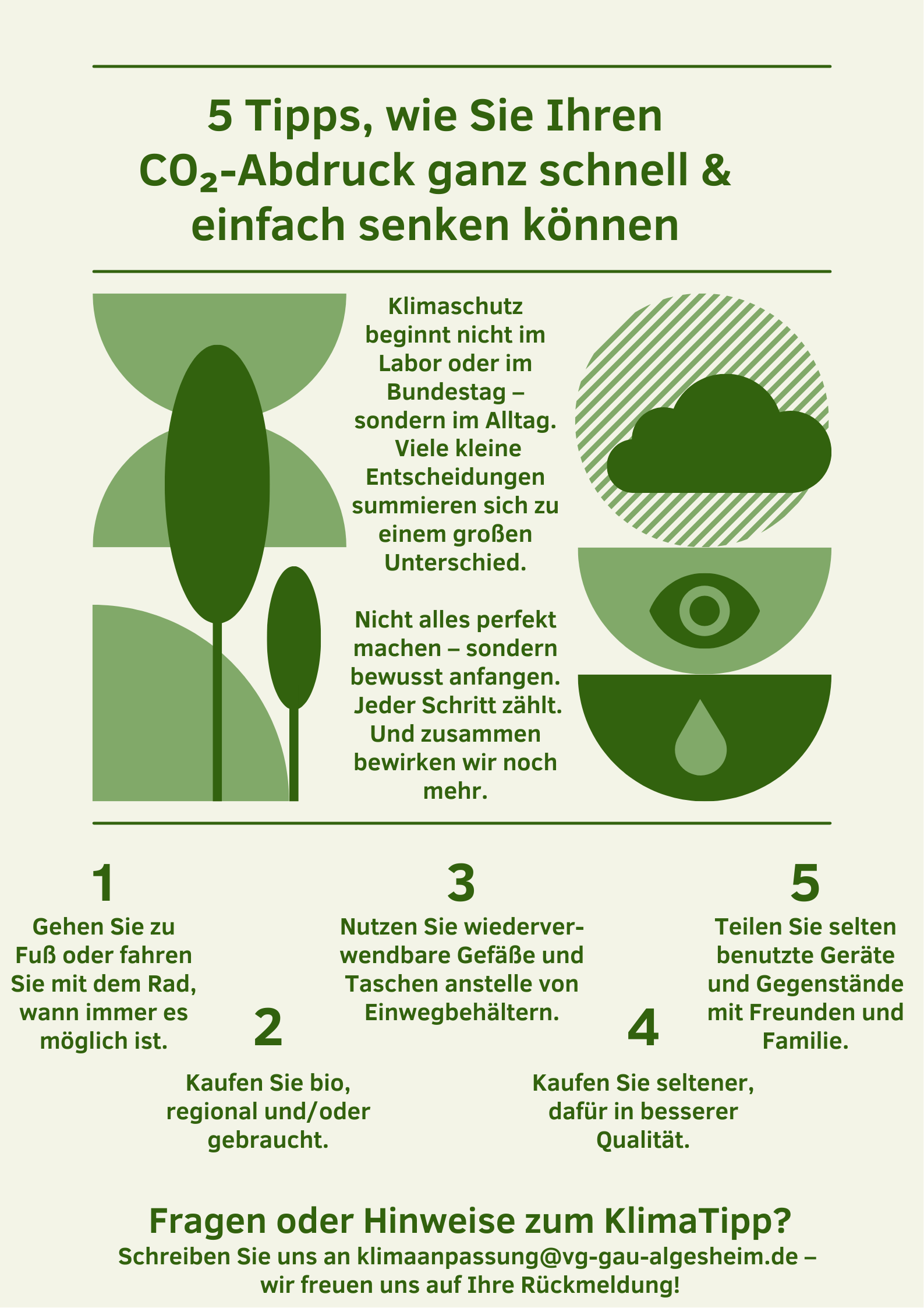 Mit dem KlimaTipp der Woche möchten wir Bürgerinnen und Bürgern einfache, alltagsnahe Anregungen geben, wie jede und jeder einen Beitrag leisten kann – sei es durch Klimaschutz, Anpassung an den Klimawandel oder nachhaltige Lebensgewohnheiten. Die Tipps erscheinen wöchentlich im Amtsblatt sowie auf unseren Social-Media-Kanälen und werden auf dieser Seite zum Nachlesen gesammelt.
