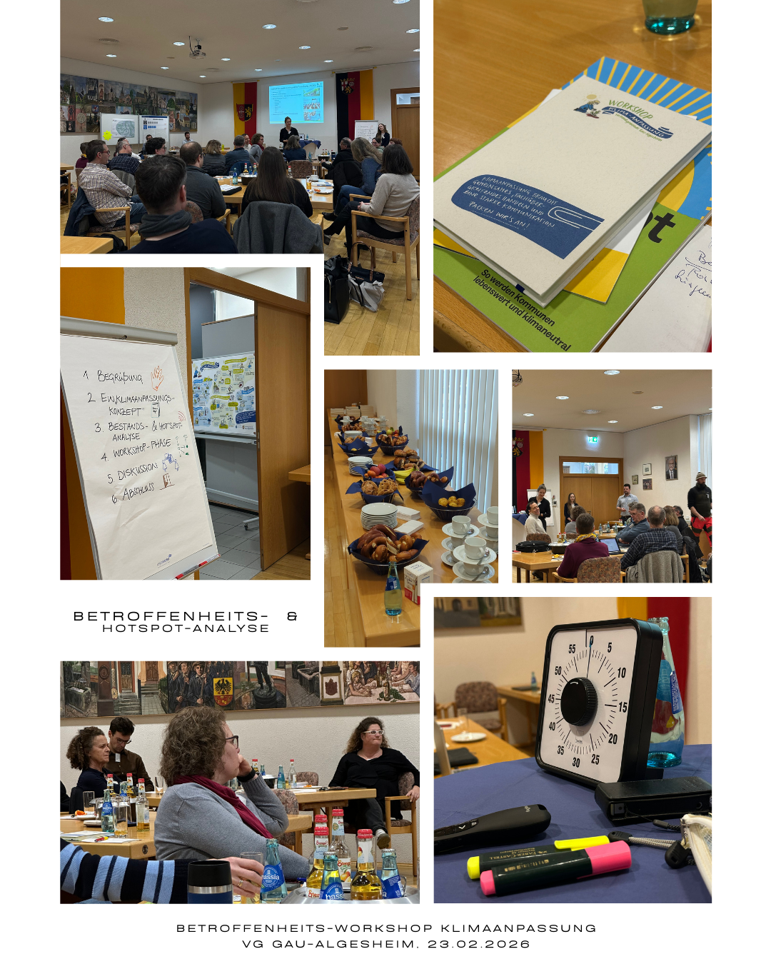 Der Einstieg in den Betroffenheits-Workshop für das Klimaanpassungskonzept stellte ein kurzer Rückblick auf die Bestandsaufnahme dar, inklusive des Graphic Recordings aus dem Auftaktworkshop. Die Vorstellung der Betroffenheits- und Hotspotanalyse zeigte, wie Klimadaten mit sozialen, demographischen und infrastrukturellen Indikatoren kombiniert wurden, um für jedes Handlungsfeld besonders betroffene Bereiche im VG-Gebiet kartographisch als Hotspots sichtbar zu machen.